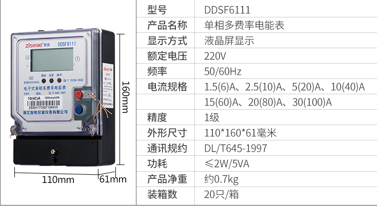 DDSF6111單相電子式多費率電能表,采用單片機處理系統設計而成,具有電路簡單、可靠性高、成本低等優點。該產品軟件、硬件、結構設計技術先進,計量精度高,結合單片機資源,實現電能分時計量,具有紅外及RS-485通信功能,抗干擾、防攻擊性能好,工作溫度范圍寬,能長期穩定可靠工作。該產品各項性能指標符合國家GB/T 17215-2002《1級和2級靜止式交流有功電能表》、GB/T 15284-2002《復費率(分時)電能表特殊要求》、DL/T 645-1997《多功能電能表通信規約》等標準的技術要求。